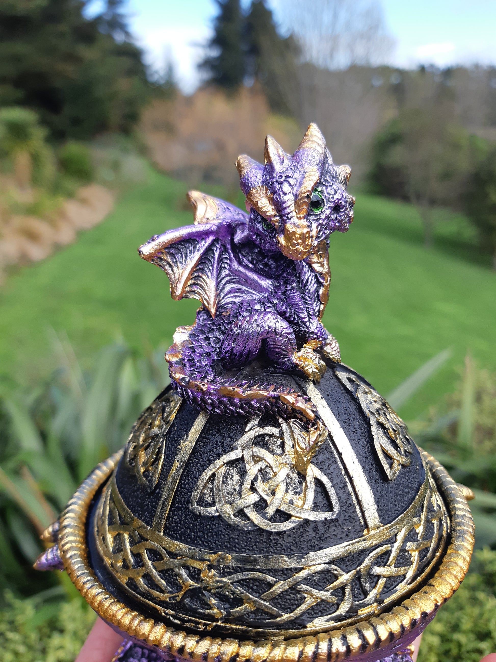 A resin dragon design storage dome with a dragon guarding all of your crown jewels. This eye-catching style is perfect for holding small crystals, herbs and other small objects for safe keeping. Cast in the finest resin before being hand-painted.