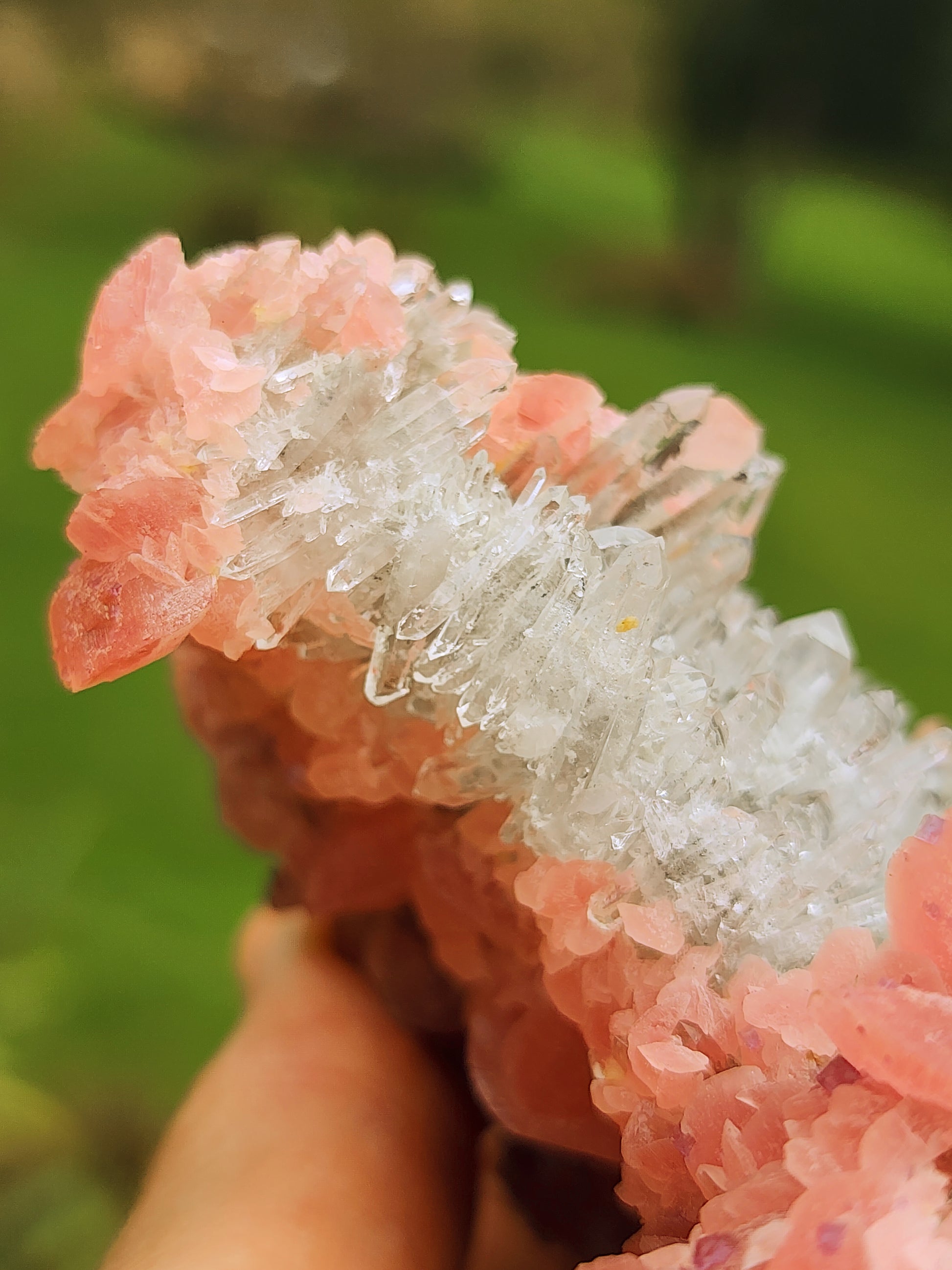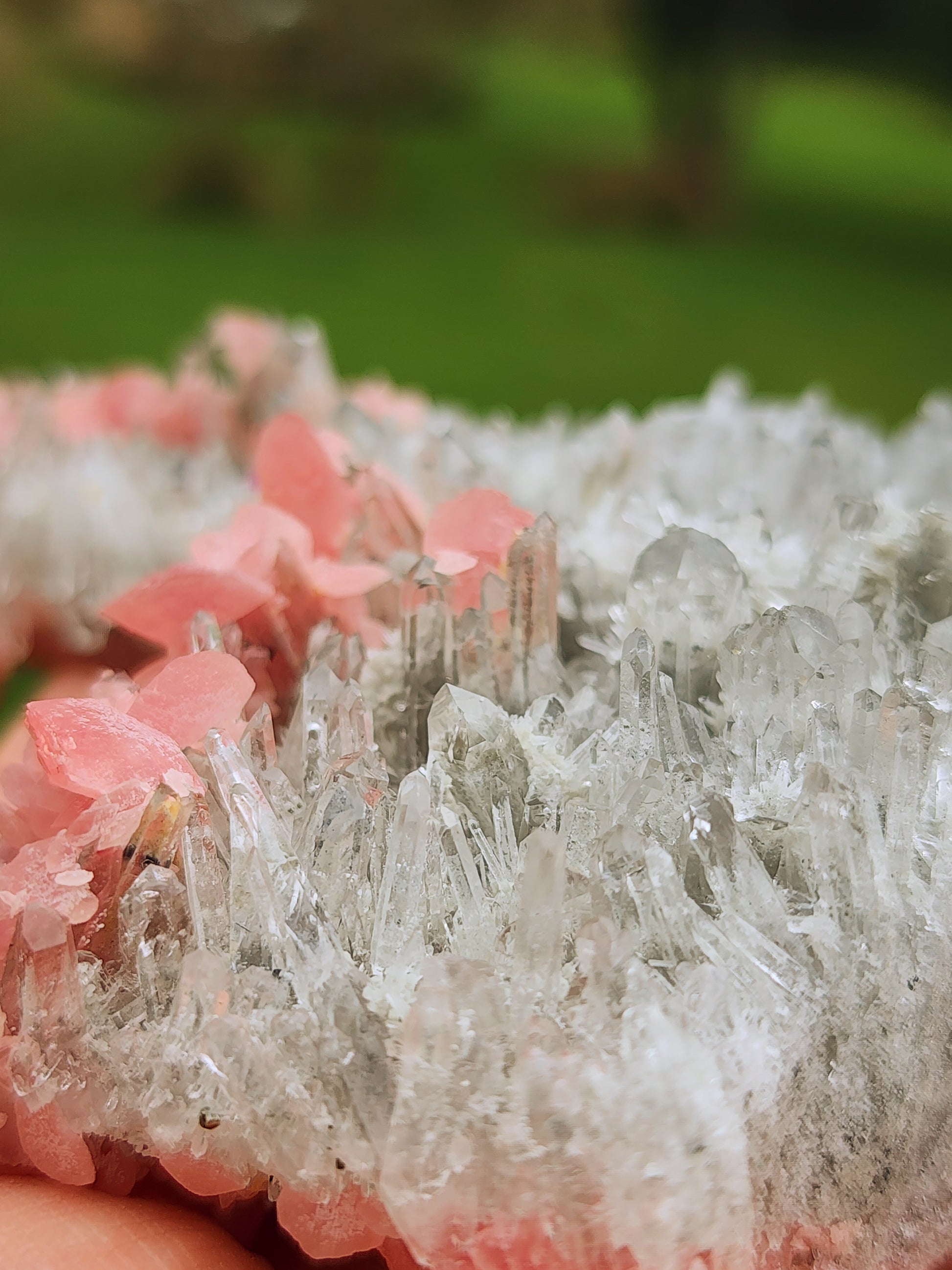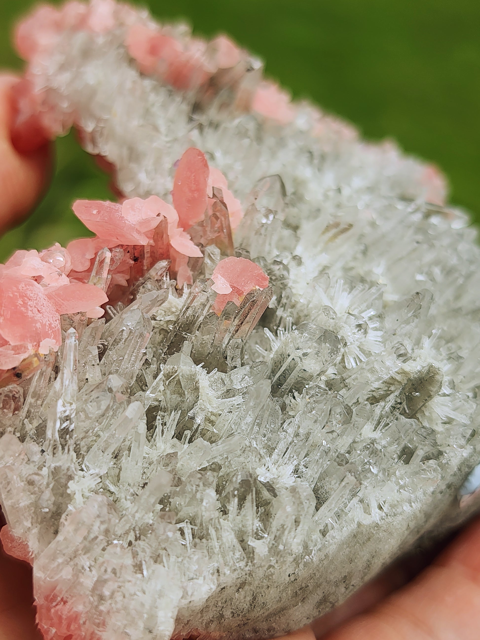 An absolutely stunning bright rhodochrosite specimen with UV reactive fluorite and pyrite. The back is covered in tiny quartz points and quartz flowers.